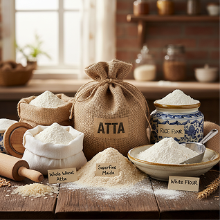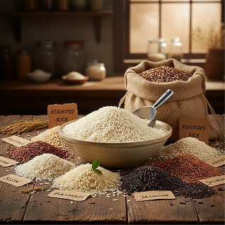 Daily essentials including tea, coffee, rice, eggs, and premium cooking ingredients